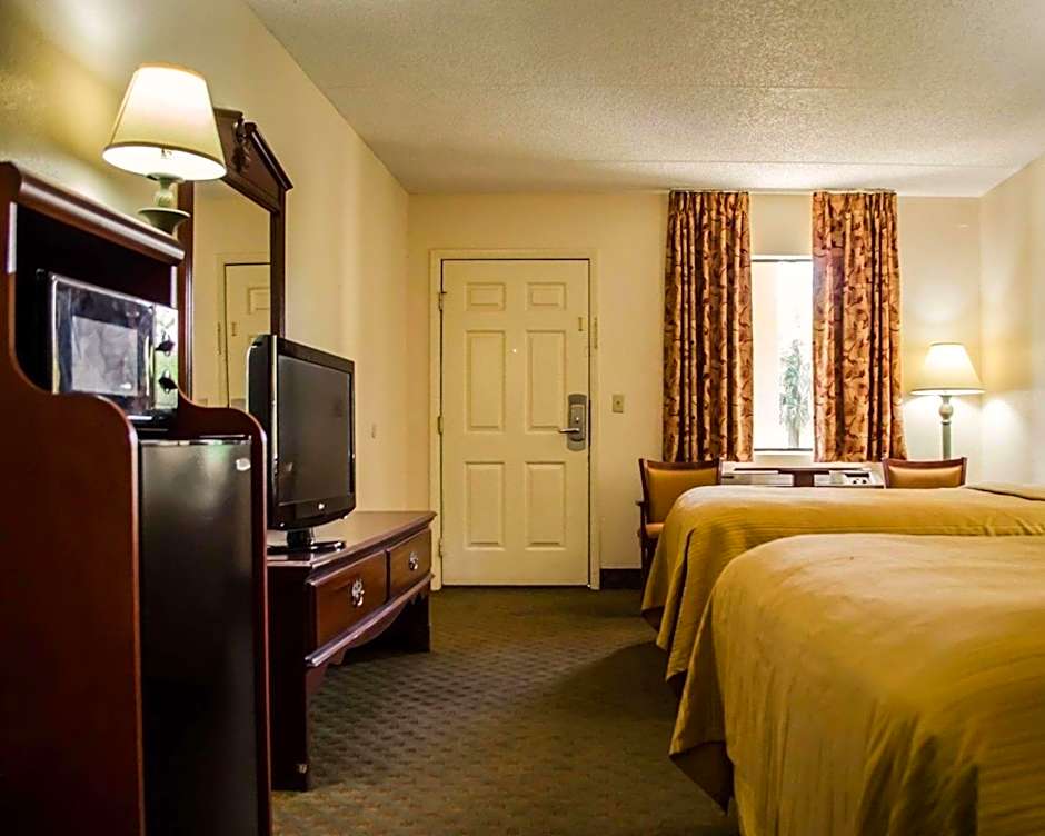 This room features a 32-inch flat-screen TV, coffee machine, microwave, and small refrigerator.